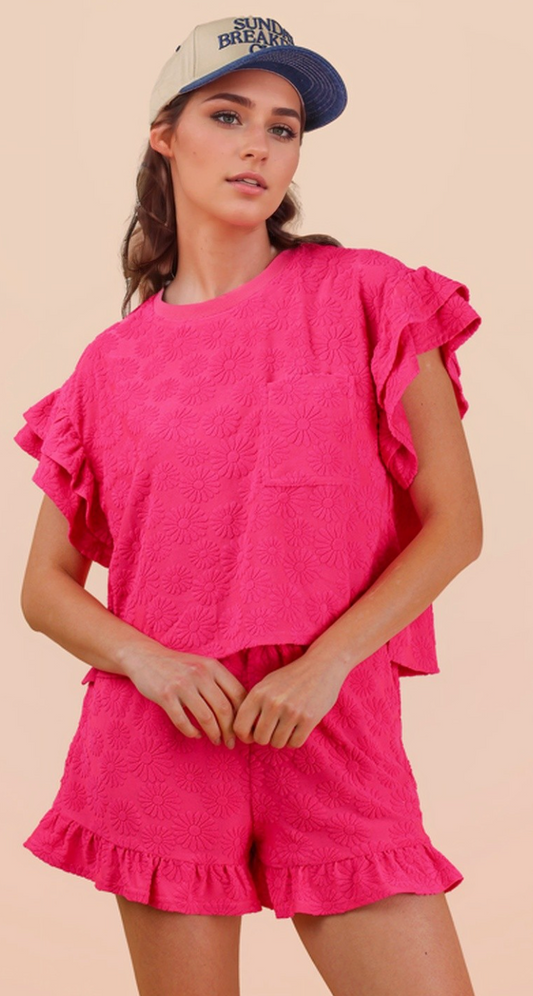 Floral Textured Ruffled Knit Top & Shorts Fuchsia