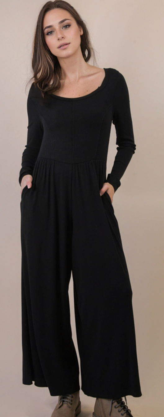 Wide Leg Solid Knit Casual Jumpsuit Black