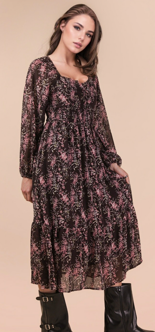 Floral Printed Smocking Torso Midi Dress Burgundy