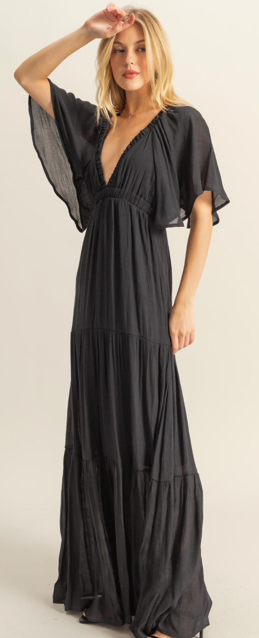 V Neck Flowy Sleeves Tiered Maxi Dress