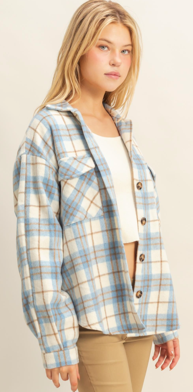 Make this season a groovy one with this shacket! Covered in a plaid print, this shacket has a collared neckline and a drop shoulder. The slightly oversized bodice has two front flap pockets and a functional button placket down the center. 100% POLYESTER
